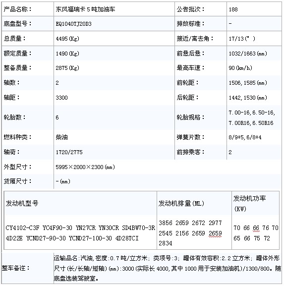 3.加油車根據(jù)用戶要求,可安裝齒輪泵、離心泵、重油泵、不銹鋼泵,可加裝加熱管、保溫層。罐體有橢圓罐、方罐等。