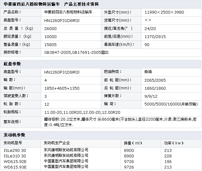 華菱前四后八粉粒物料運(yùn)輸車(chē)  底盤(pán)型號(hào):HN1260P31D6M3J 額定質(zhì)量:10000