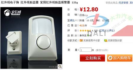小編測(cè)試的這個(gè)紅外報(bào)警器是在淘寶商城上買的,非常的便宜才12.8元,加上10快錢的郵費(fèi)也就20多塊。