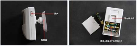 打開外包裝,紅外報(bào)警器的外觀簡(jiǎn)潔明了,正面為感應(yīng)區(qū)與喇叭,側(cè)面是開關(guān),后部是萬向座與電池倉(cāng)。