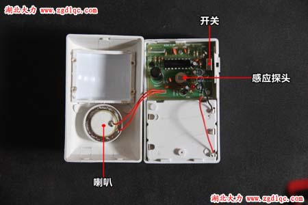 拆開紅外線報(bào)警器,內(nèi)部結(jié)構(gòu)主要分為兩部分:喇叭與電路板。喇叭就不說了,電路板上主要有感應(yīng)探頭與開關(guān)兩大元件。