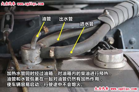水加熱探管采用發(fā)動機循環(huán)水的溫度來加熱油箱內(nèi)柴油,類似給油箱內(nèi)加裝了“暖氣片”。詳細改裝過程請點擊《柴油加熱器》一帖。這類改裝能夠保證安全性,加熱穩(wěn)定,配合加裝柴油鍋爐,將使車輛順利完成冷啟動過程。