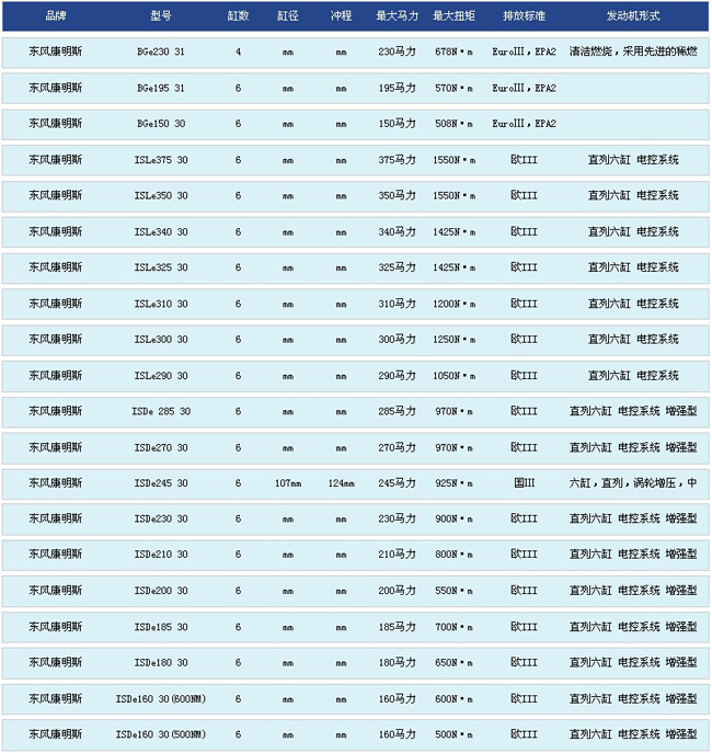 東風(fēng)康明斯發(fā)動(dòng)機(jī)部分型號(hào)圖表