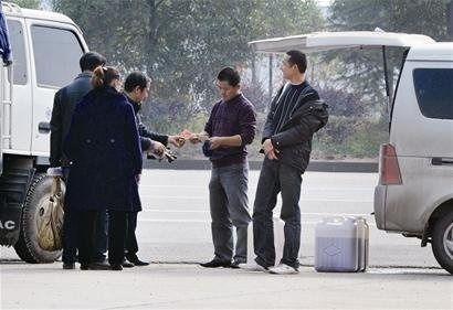 在劉師傅指點(diǎn)下,昨日上午10時(shí)許,記者趕到沌口東風(fēng)大道的三豐加油站,遠(yuǎn)遠(yuǎn)地就看到加油站掛著“柴油售罄”的告示牌。可加油站入口處停著幾輛“流動加油車”——一些面包車車廂內(nèi)裝有一個500升的大油桶,車旁還有幾個裝滿柴油的塑料油桶依次排開,車主則在一旁叫賣柴油。